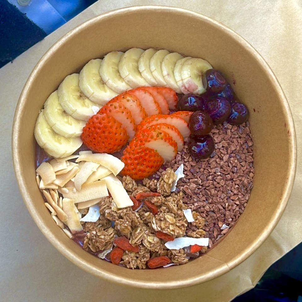 このような栄養価の高いアサイーをピューレにしフルーツやグラノーラなどをトッピングした、人気の健康的な食べ物をアサイーボウルと呼ばれています!!